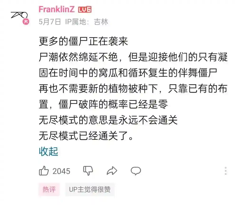 这些人们的学究精神也并没到此为止,“使用更少的Bug”“更宽松的条件”“更稳定的复现”已经成为了新的目标,属于PVZ无尽模式研究的故事,还远没有到达结局。