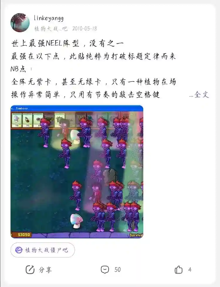 可玩家们从未放弃对原版无尽的继续研究——他们的目标不仅是“无尽”,还要为阵型附加高大上的需求:降低阵型容错率、让更多种类的植物上场、赋予阵型寓意和美感等。就算圈内技术党屡次换代,也总有后来人接手事业。