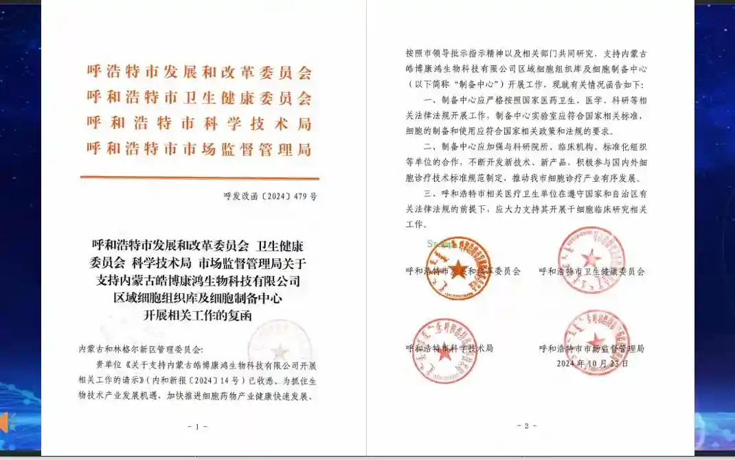 一、皓博康鸿的内蒙古组织细胞库及细胞制备中心正式获得政府四部门批准!